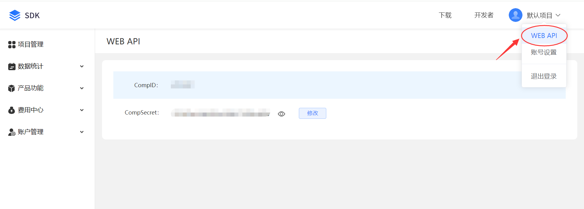 企业CompID和企业密钥CompSecret可以登录管理平台,在【WEB API】处获取